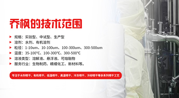 上海喬楓實業有限公司,成立于2012年,是從事噴霧干燥設備的研發設計、生產、銷售(小型噴霧干燥機實驗型噴霧干燥機,35℃低溫噴霧干燥機,有機溶劑噴霧干燥機低溫閉式循環噴霧干燥機、超細粉末噴霧干燥機、噴霧冷凍干燥機、真空噴霧干燥機、氣流噴霧干燥機,噴霧造粒干燥機,離心噴霧干燥機,沸騰制粒機等)和售后于一體的綜合性公司,本公司現成為一家致力于為生物制藥、精細化工、新能源、陶瓷造粒及食品工程等領域提供全套解決方案的整線交鑰匙工程企業。